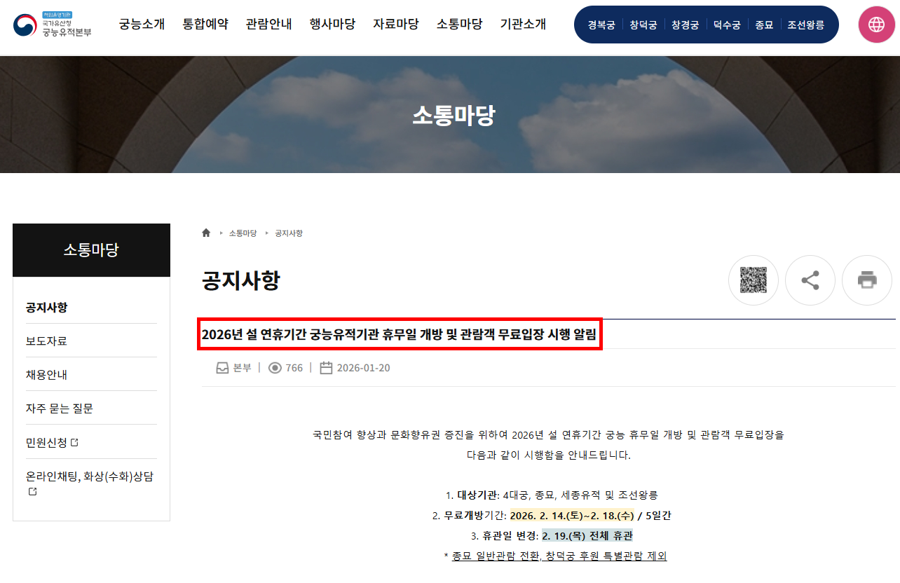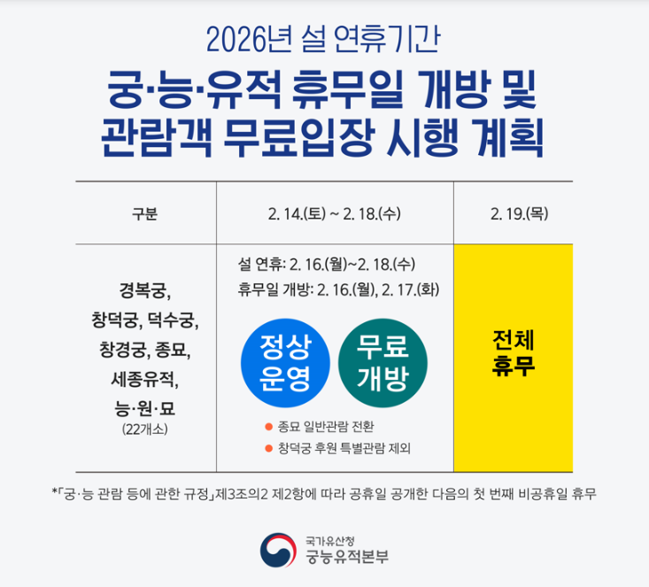 2026년 설 연휴를 맞이해 2월 14일(토)부터 2월 18일(수)까지 총 5일간, 다음의 유적들이 무료 개방돼요.