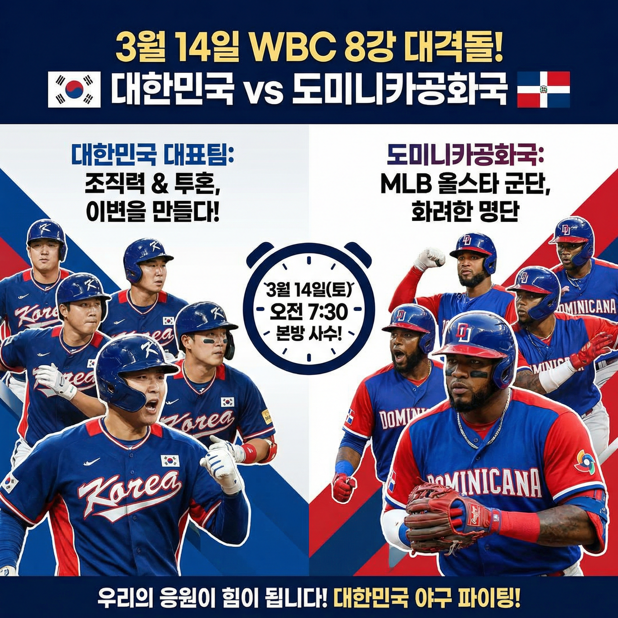 우선 일정부터 다시 확인해 볼까요? 우리 대표팀이 8강에 진출할 경우 만나게 될 WBC 야구 8강 상대와의 결전은 2026년 3월 14일 토요일 오전 7시 30분에 시작됩니다.